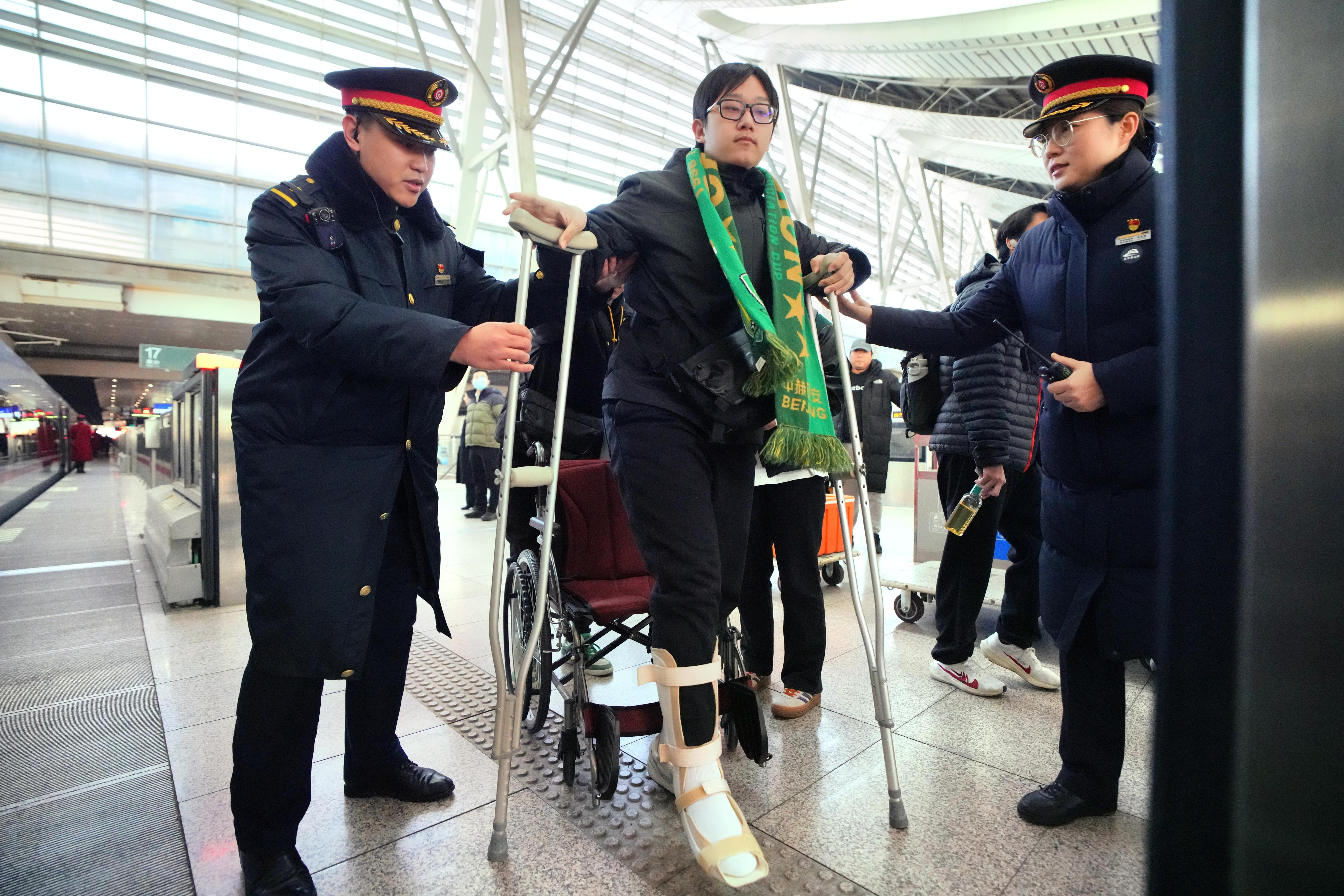候车的东说念主群中,轮椅上的17岁球迷张宸铭成为全球关注的焦点。“这是真球迷。”同业的伙伴纷繁朝他伸出大拇指。面临全球的情态,张宸铭有些不好根由。他说,我方很早就决定到苏州看球,不巧的是一周前偶而骨折了。但为了简略亲眼见证国安队在决赛中的进展,他照旧坚捏坐着轮椅前去。“这样多年才有一次契机,一定要珍爱。”张宸铭的父亲说,他前一天通过12306预约了重心搭客劳动,这次出行特地顺畅。